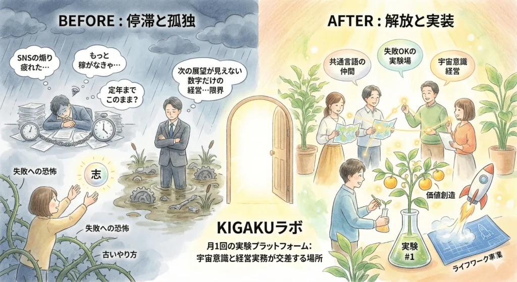 KIGAKUラボは、良識ある大人が安心して本音を語り、失敗できる良質で安全なコミュニティを目指します。
